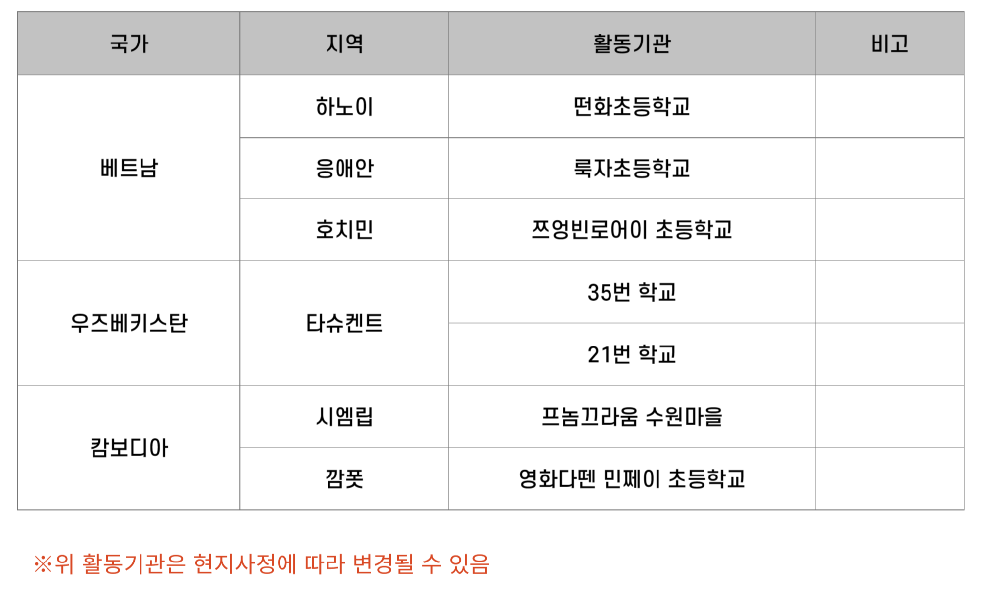 - 국내 교육의 모든 과정을 이수해야만 봉사단원 자격이 부여됩니다