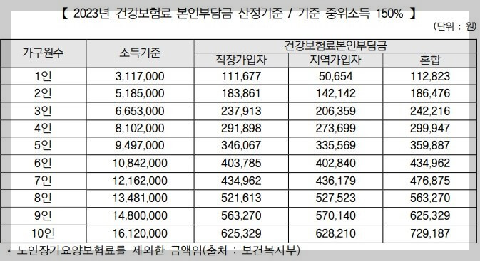 ▷ 2023.10 ~12 월 3개월 평균 "건강보험료 고지 금액"이 가구 기준 중위소득 150% 이하의 건강보험료 고지 금액 이하여야 함