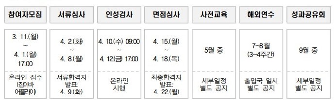 - 사전교육, 해외대학 연수, 성과공유회, 사후관리 프로그램 참여가 가능한 청년으로 선발