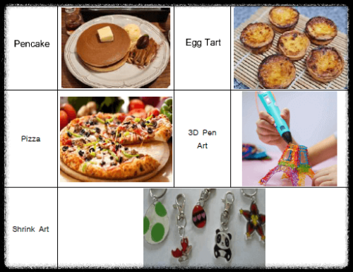 -원어민 교사와 함께 예술과 외국 문화를 배우고 체험하는 클래스로 활동 내용은 Pancake, Egg Tart, Pizza, 3D Pen Art, Shrink Art입니다