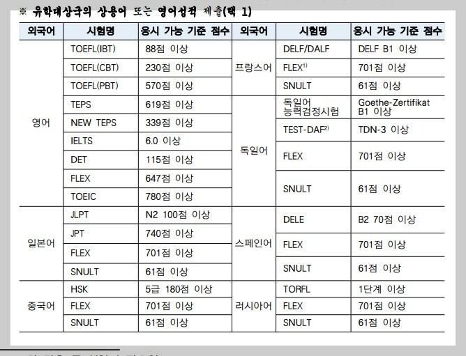 외국어시험 성적이 아래 기준 점수의 하나 이상에 해당되는 사람 *유학대상국의 상용어 또는 영어성적 제출 (택 1)